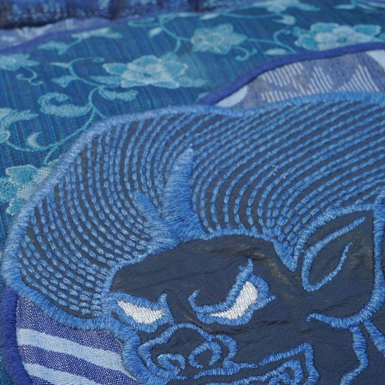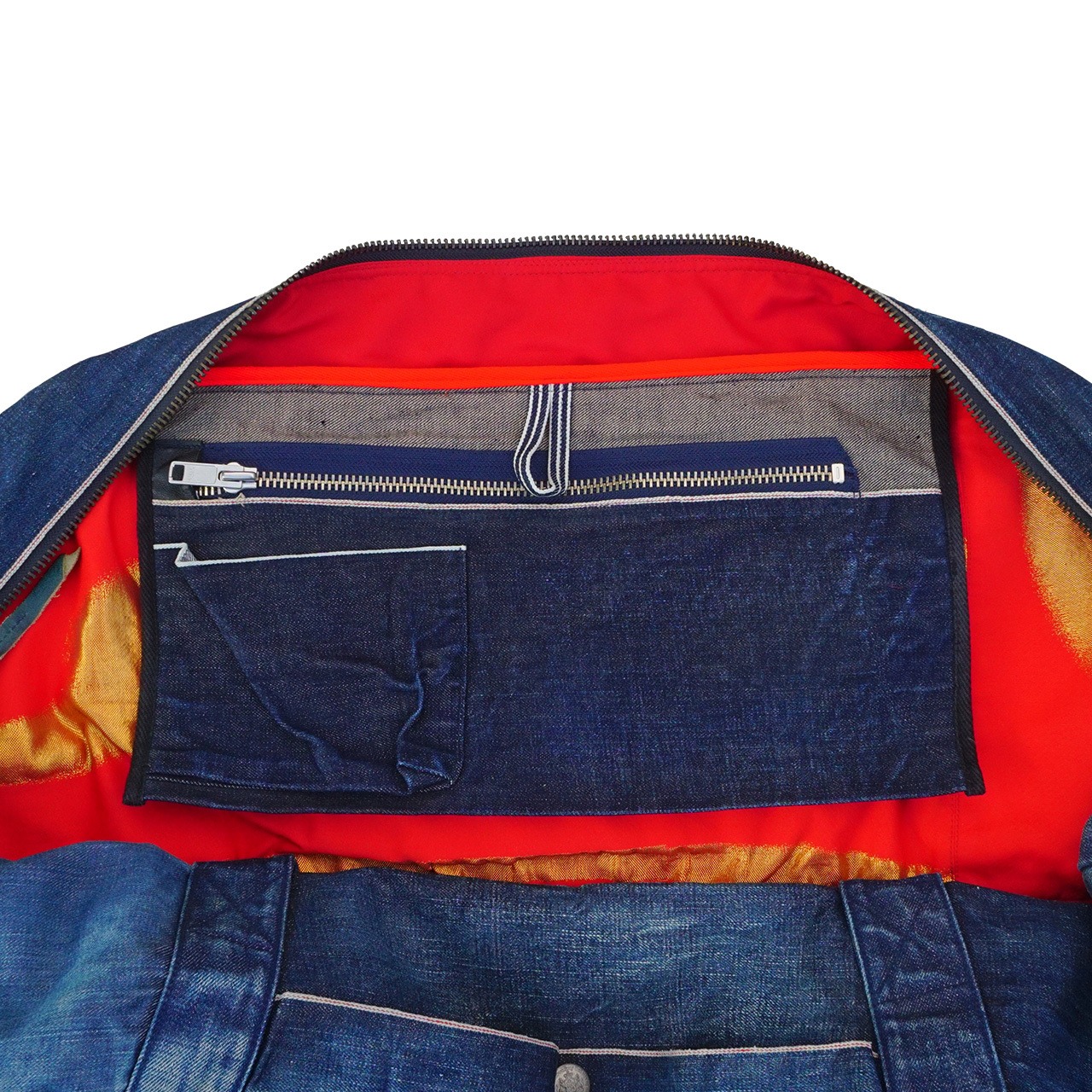 セルビッチデニム、革、緞子、リフレクター、刺繍、こすりなど